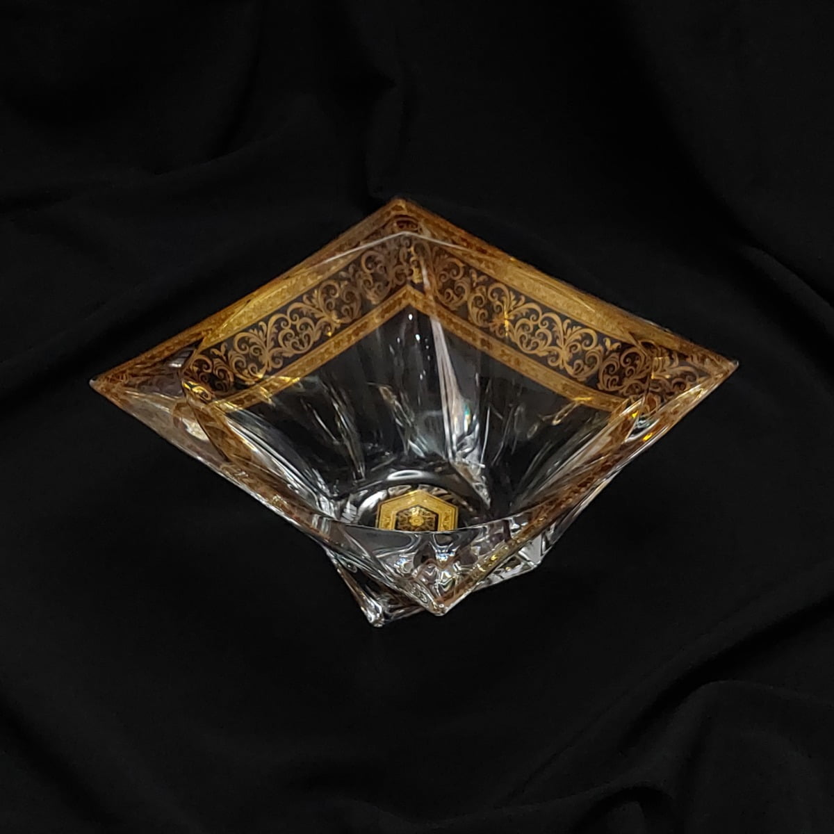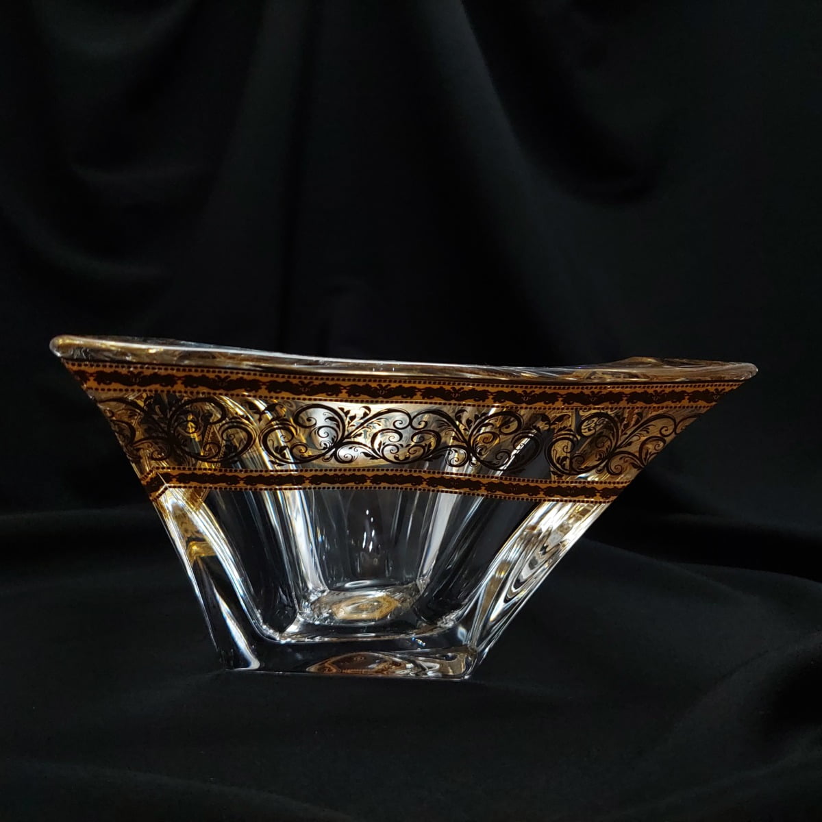 Dodajte sofisticiranu eleganciju svom enterijeru. Prefinjena činija, izrađena od najkvalitetnijeg češkog kristala, oduševljava svojim jednostavnim, ali izuzetno luksuznim dizajnom. Diskretni, ručno pozlaćeni motiv od 24-karatnog zlata delikatno krasi površinu činije, stvarajući ekskluzivan detalj koji unosi prefinjenu raskoš u svaki prostor.