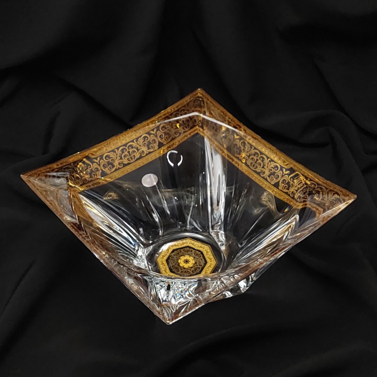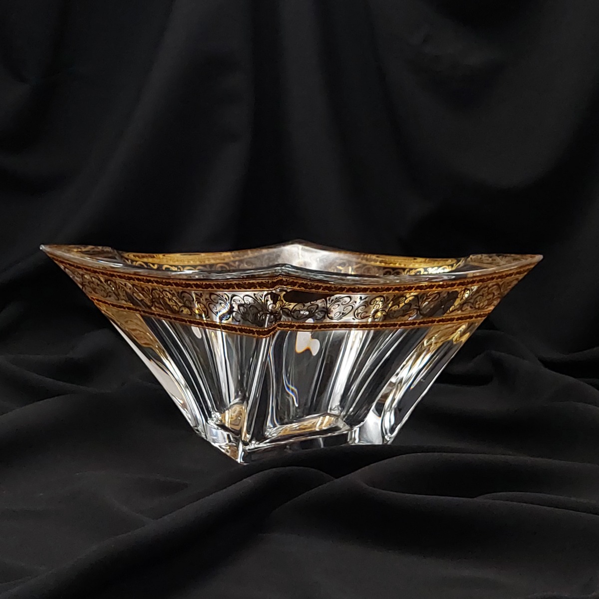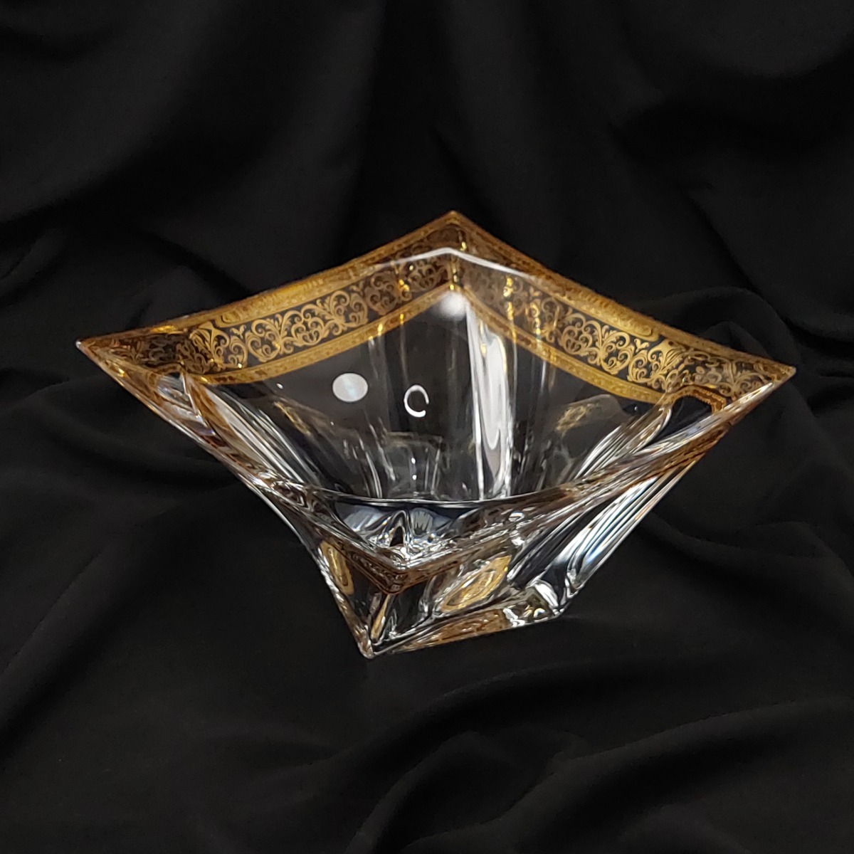 Dodajte sofisticiranu eleganciju svom enterijeru. Prefinjena činija, izrađena od najkvalitetnijeg češkog kristala, oduševljava svojim jednostavnim, ali izuzetno luksuznim dizajnom. Diskretni, ručno pozlaćeni motiv od 24-karatnog zlata delikatno krasi površinu činije, stvarajući ekskluzivan detalj koji unosi prefinjenu raskoš u svaki prostor.