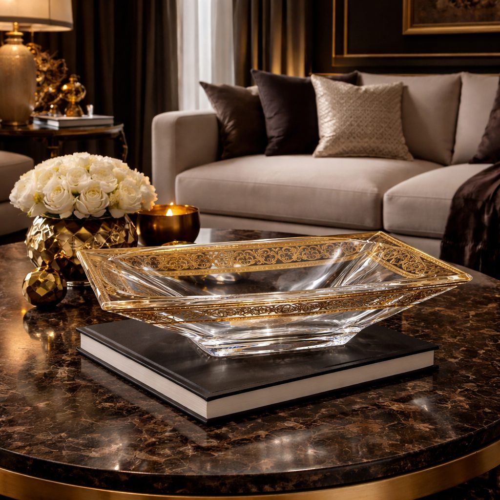Dodajte sofisticiranu eleganciju svom enterijeru. Prefinjena činija, izrađena od najkvalitetnijeg češkog kristala, oduševljava svojim jednostavnim, ali izuzetno luksuznim dizajnom. Diskretni, ručno pozlaćeni motiv od 24-karatnog zlata delikatno krasi površinu činije, stvarajući ekskluzivan detalj koji unosi prefinjenu raskoš u svaki prostor.