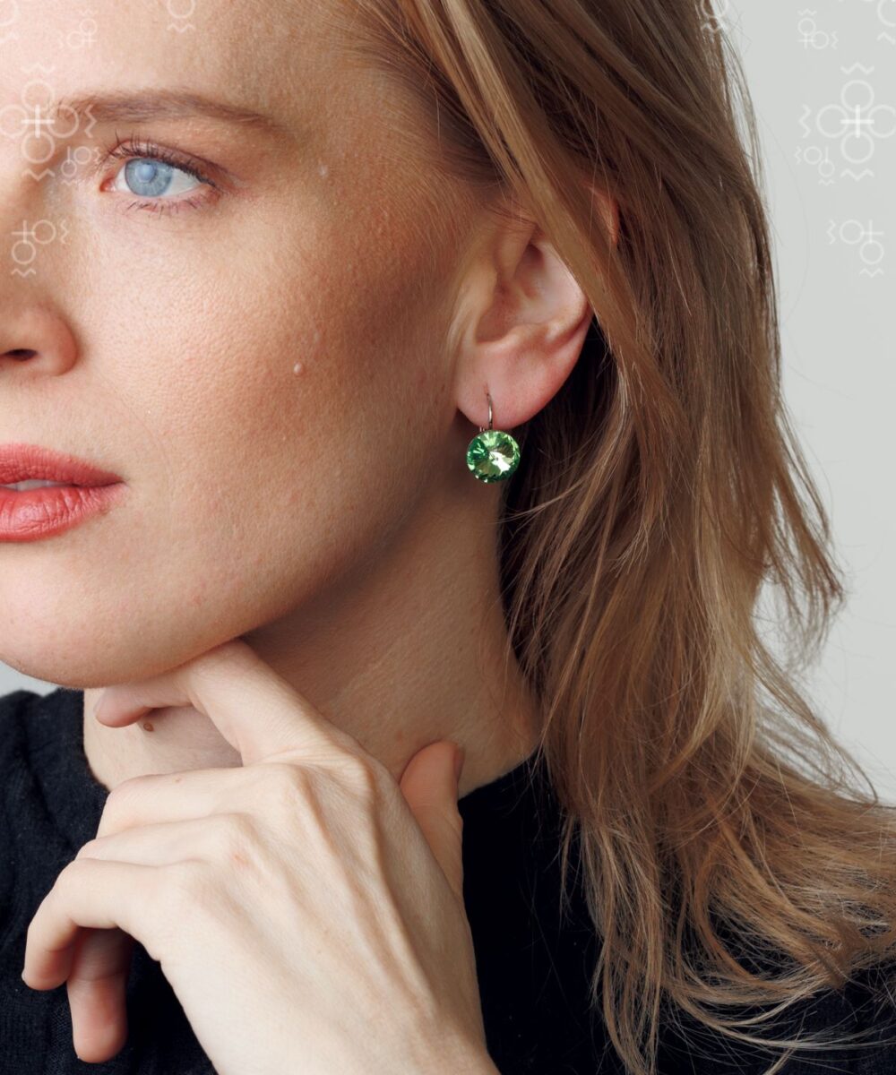 Nežne i elegantne, ove ručno rađene naušnice ukrašene su originalnim Swarovski® kristalima u zelenoj (Peridot) boji. Okrugli kristali rivoli prečnika 12 mm savršeno su brušeni do vrha, stvarajući efekat sjaja koji se presijava pri svakom pokretu.