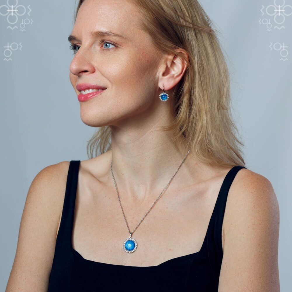 Ručno rađena ogrlica sa Swarovski® kristalima – Ukrašena kabošon staklena kupola. Istaknite svoju jedinstvenost uz ovu originalnu ručno rađenu ogrlicu sa efektno oblikovanom muglom (kupolastim staklom), ukrašenom Swarovski® kristalima u prelepoj nijansi Dark Aqua Silver. Ogrlica koja pleni pažnju i postaje vaš prepoznatljiv modni detalj.